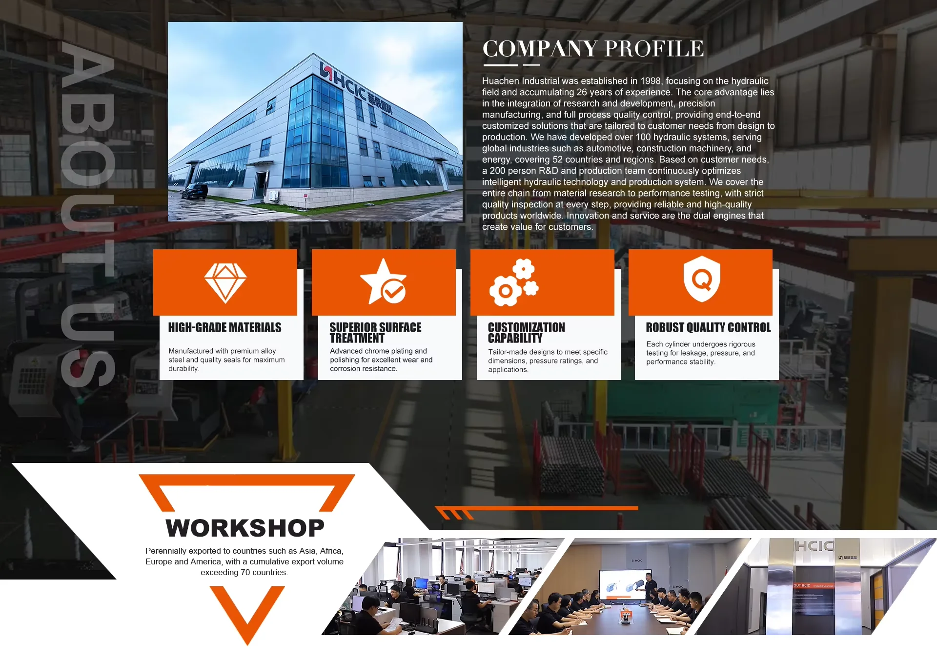 HCIC Hydraulic - гидравликалық жүйені жобалауға, өндіруге, орнатуға, түрлендіруге, іске қосуға және гидравликалық компоненттерді сатуға маманданған кәсіби гидравликалық өндіруші. Біз техникалық қызметтерді ұсынамыз және тұтынушыларымызға ең талап етілетін талаптарға сәйкес келетін қауіпсіз және сенімді өнімдерді ұсынуға дайынбыз. HCIC инженерлік тобы тұтынушылардың қолданбаларын түсіну үшін олармен тығыз жұмыс істейді. Теңдесі жоқ инженерлік және өндірістік тәжірибемен қоса, дәлелденген дизайн әдістері мен озық өндірістік жабдықтарды пайдалана отырып, HCIC Hydraulics теңдесі жоқ тұтынушыларға қызмет көрсету арқылы маңызды қолданбалар үшін қауіпсіз және сенімді гидравликалық цилиндрлерді әзірлейді. Біз гидравликалық цилиндрлерді заманауи өндіріс орнында жобалаймыз, құрастырамыз және шығарамыз және тұтынушыларымызға ең жоғары сапалы өнімдерді қамтамасыз ету үшін ISO 9001-2015 сертификатталған сапа менеджменті жүйесін ұстанамыз.